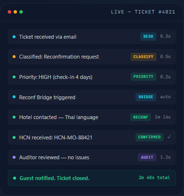 Zeal Connect deploys AI agents that handle hotel reconfirmations and customer support — so your ops team stops firefighting and starts scaling.